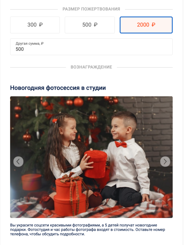 «Перед Новым годом мы хотели рассказать о добрых делах и собрать средства для проведения новогоднего праздника, поэтому выбрали два сценария. Первый — сбор средств для проведения мастер-классов «Подарок своими руками» для находящихся в больницах учеников инклюзивной школы и подопечных дома-интерната для престарелых и инвалидов в Карелии. Второй — вознаграждения за пожертвования с призывом подарить близким сувениры ручной работы».