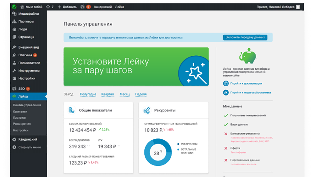 Плагин – это расширение для сайта, предназначенное для добавления новых функций. «Лейка» играет роль промежуточного звена между жертвователем и платежной системой. Плагин не собирает комиссию и записывает только те данные, которые необходимы для коммуникации. Деньги проходят через платежную систему и отправляются на расчетный счет организации.