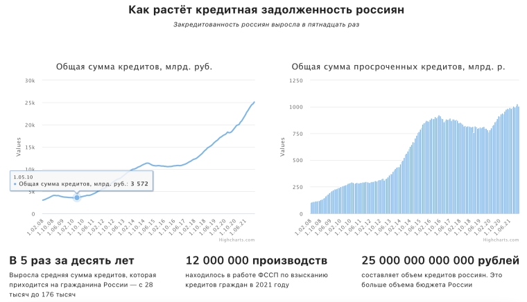 С 2019 года россияне брали кредиты более 38 миллионов раз, большой скачок пришелся на 2021 год. А всего за десять лет средняя сумма кредитов, которая приходится на гражданина России, выросла с 28 тысяч до 176 тысяч рублей. Закредитованность становится серьезной социальной проблемой. К таким выводам пришла команда проекта «Кредитный прожектор», которая победила на хакатоне «Прожектор 2022» Теплицы и «Новой газеты».
