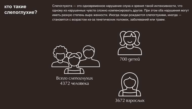 На начало 2022 года в базе Фонда «Со-единение» содержатся данные о 4372 людях с одновременными нарушениями слуха и зрения в России. Участники продолжат свое исследование, и это покажет, как распределяется этиология слепоглухоты в течение века.