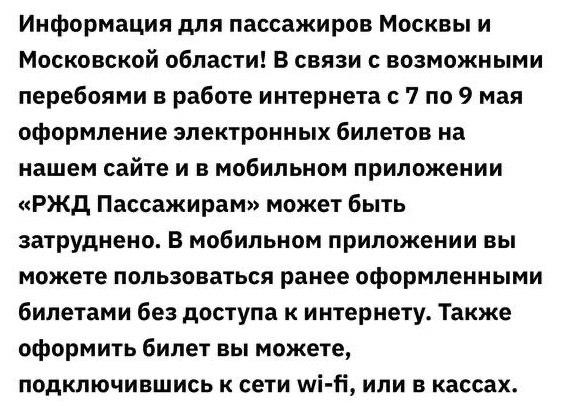 У некоторых москвичей отключился и домашний интернет. Так, на это пожаловались абоненты Beeline, причем не только в Москве, но и по всей России. Без связи остались жители Ярославской, Владимирской, Курской, Калужской областей«, пишет издание The Insider в материале «Если умрем, то без стресса»: как Москва живет без мобильной связи перед Днем Победы.